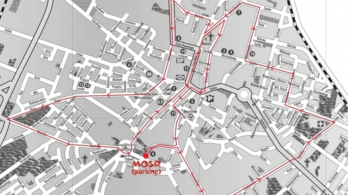 MOSiR (parking) - Trębickiego - Broniewskiego - Podstoczysko - Szpitalna - Dubois - Tysiąclecia - Szkolna - Widnichowska - Lipowa - Armii Krajowej - Wileńska - Młyńska - Lubiejewska - Prusa - Różańska - 3 Maja - Armii Krajowej - Kościuszki - Dubois - Partyzantów - Mieczkowskiego - Broniewskiego - Trębickiego - MOSiR (parking).
