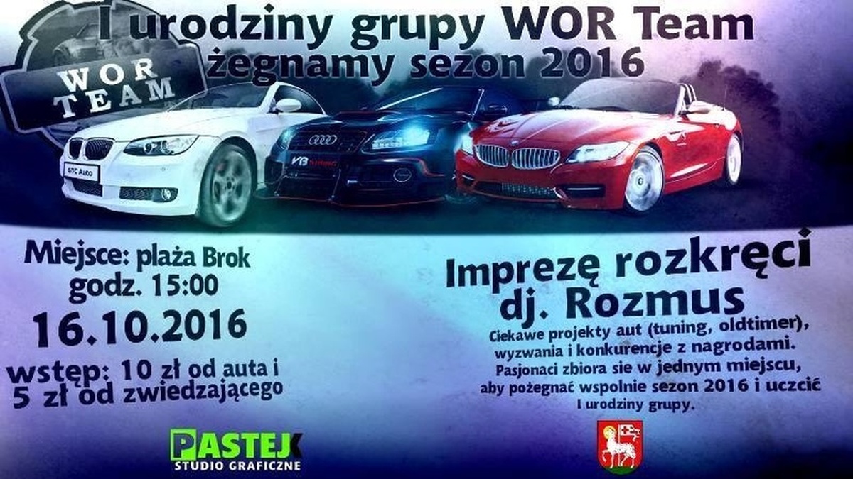 Grupa WOR Team świętować będzie swoje pierwsze urodziny. Z tej okazji na miejskiej plaży w Broku organizują w niedzielę 16 października kolejny zlot, połączony z zakończeniem sezonu motoryzacyjnego. Początek o godz. 15.00.