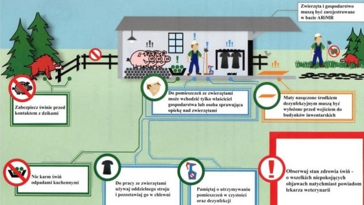- Prosimy o bezwzględne przestrzeganie zasad bioasekuracji: nie kupujcie świń z niewiadomego źródła pochodzenia, utrzymujcie świnie w sposób wykluczający kontakt z dzikami, stosujcie tylko pasze zabezpieczone przed dostępem zwierząt wolno żyjących, wyłóżcie maty nasączone środkiem dezynfekcyjnym przed wjazdami i wyjazdami z gospodarstw oraz przed wejściami do pomieszczeń, w których przetrzymywane są świnie. Przypominamy też, że za brak stosowania zasad bioasekuracji będą nakładane kary administracyjne - apeluje ministerstwo.