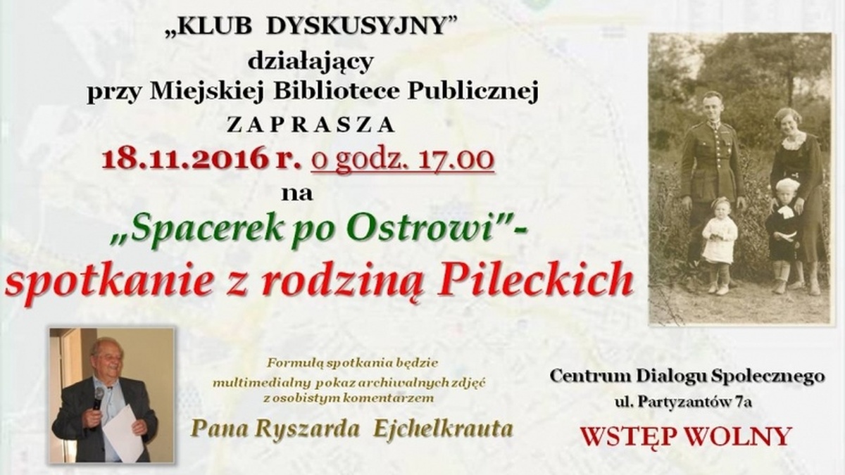 W piątek 18 listopada przy ul. Partyzantów 7A w budynku Centrum Dialogu Społecznego w Ostrowi Mazowieckiej odbędzie się kolejna część spotkania klubu dyskusyjnego pt. "Spacerkiem po Ostrowi".