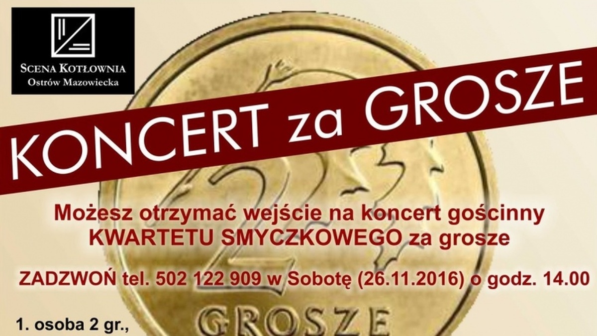 Teatr Scena Kotłownia zaprasza w niedzielę 27 listopada na koncert w wykonaniu kwartetu smyczkowego z warszawskiej Filharmonii Kameralnej. Ostrowski teatr zachęca do wzięcia udziału w koncercie za grosze.