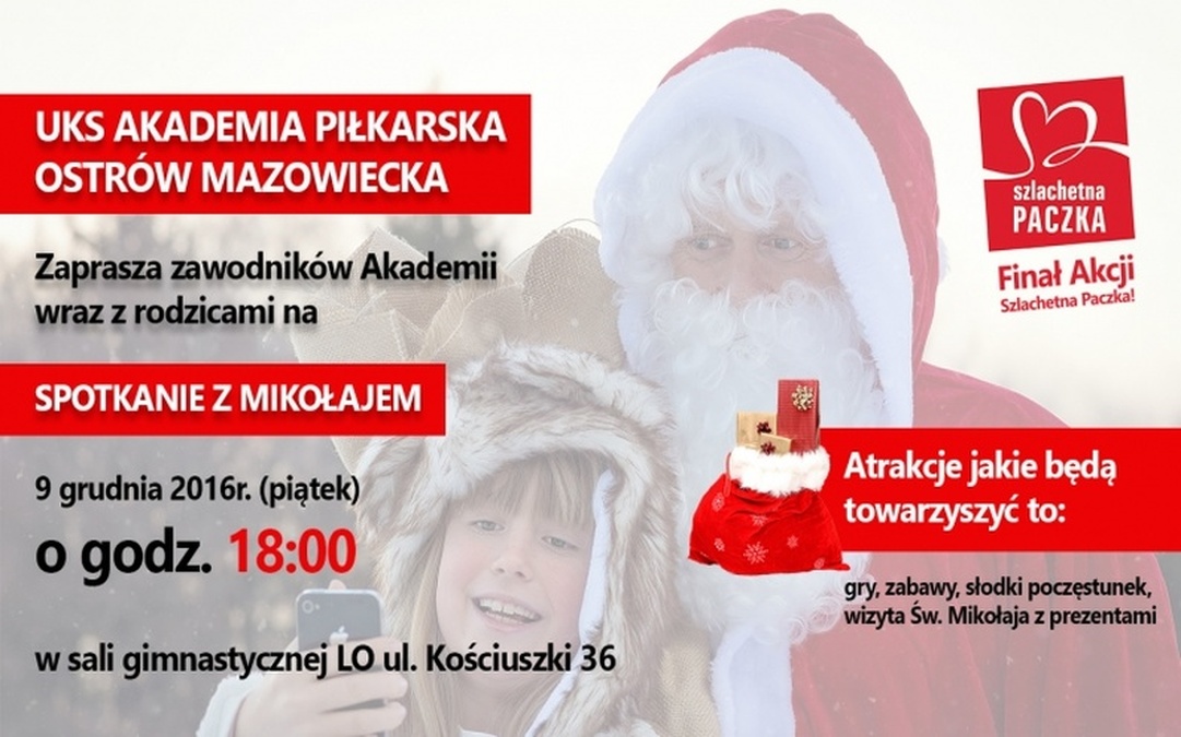 Uczniowski Klub Sportowy Akademia Piłkarska Ostrów Mazowiecka zaprasza zawodników akademii wraz z rodzicami na spotkanie z Mikołajem, które odbędzie się w piątek 9 grudnia w sali gimnastycznej Liceum Ogólnokształcącego im. Mikołaja Kopernika w Ostrowi Mazowieckiej. Początek spotkania o godz. 18.00.
