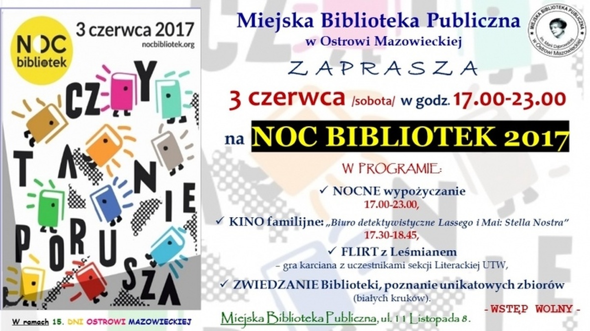 Miejska Biblioteka Publiczna w Ostrowi Mazowieckiej zaprasza przyjaciół biblioteki i wszystkich miłośników książek i czytania na wyjątkową "Noc Bibliotek", która w tym roku odbędzie się pod hasłem "Czytanie porusza". W programie przewidziano atrakcje dla dzieci, młodzieży i dorosłych.