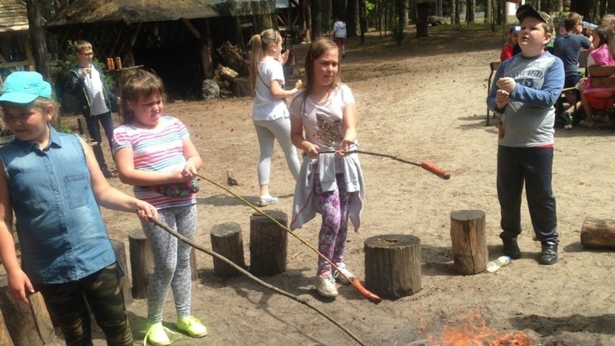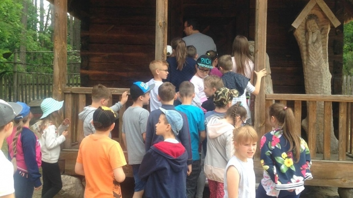 Dzieci zwiedzały jedno z najmniejszych muzeów na wolnym powietrzu w Polsce. Na obszarze 1,5 ha zgromadzono obiekty charakterystyczne dla tradycyjnego budownictwa drewnianego z terenu Kurpiowskiej Puszczy Zielonej z przełomu XIX i XX wieku.