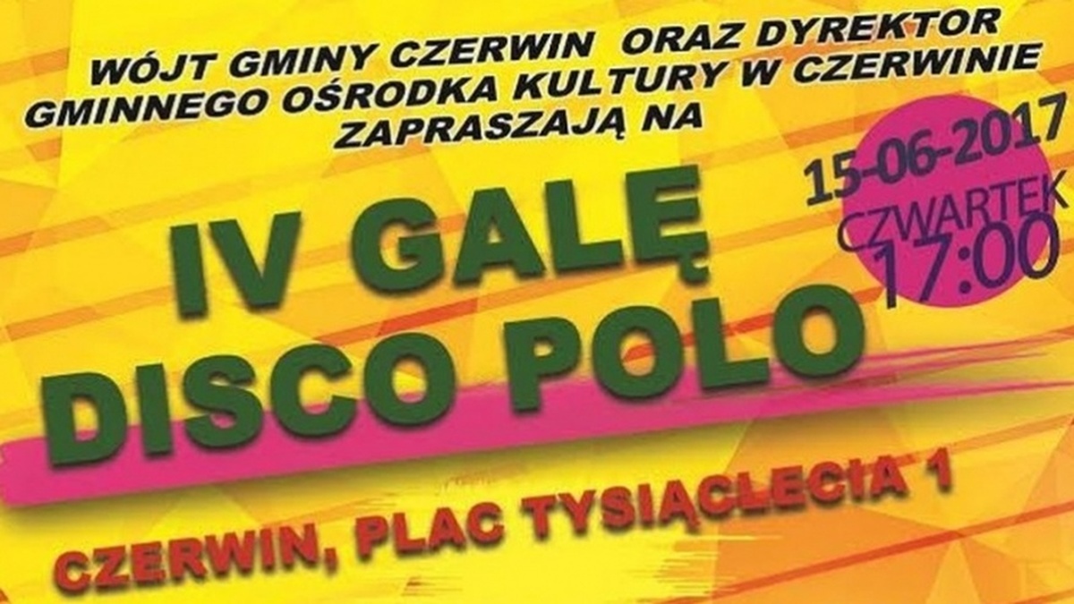 Na placu przed Urzędem Gminy w Czerwinie swoje święto będą mieli fani muzyki tanecznej. A wszystko za sprawą IV Gali Disco Polo, na którą zapraszają wójt gminy oraz dyrektor Gminnego Ośrodka Kultury. Na scenie zaprezentuje się aż osiem zespołów.