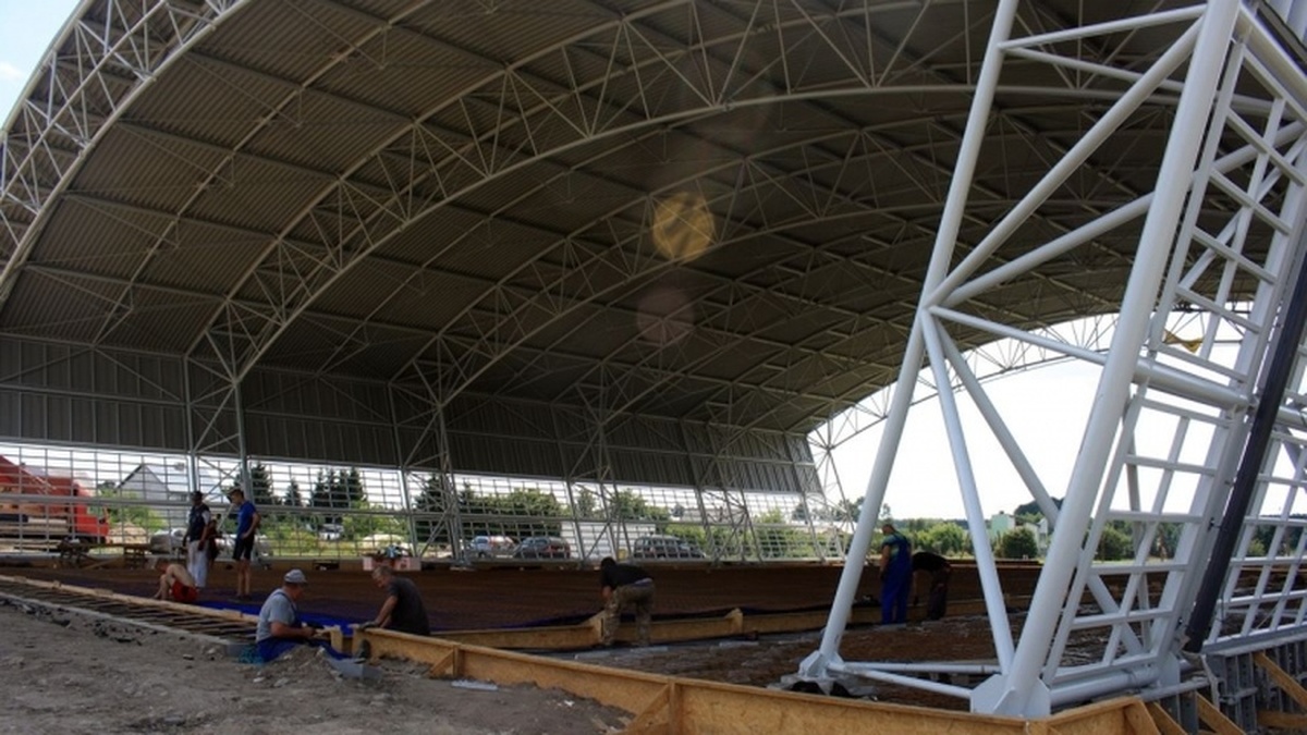 Budowa została wykonana na obszarze 1564 m kw., a najwyższy punkt dachu sięga 12,63 metrów. Obecnie trwają prace nad płytą boiska-lodowiska, instalacją sanitarną i elektryczną.