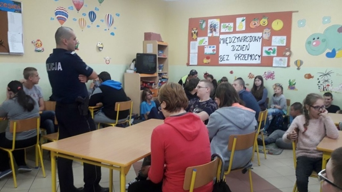 Uczniowie i nauczyciele Zespołu Szkół Specjalnych w Starym Lubiejewie również włączyli się w obchody Międzynarodowego Dnia bez Przemocy. Z tej okazji szkołę odwiedził starszy sierżant Marcin Jeliński w wydziału ds. nieletnich ostrowskiej komendy policji.