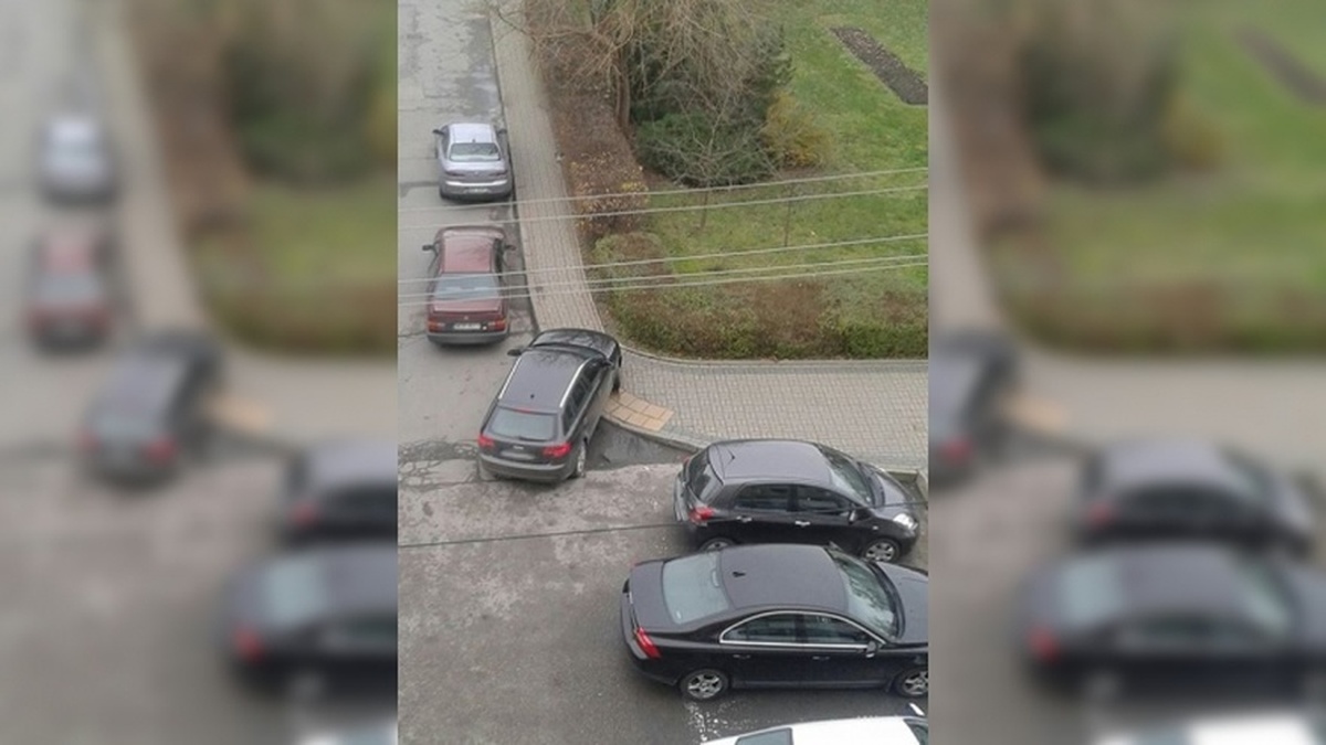 Kierowca zaparkował auto na chodniku, utrudniając przejazd innym użytkownikom parkingu.