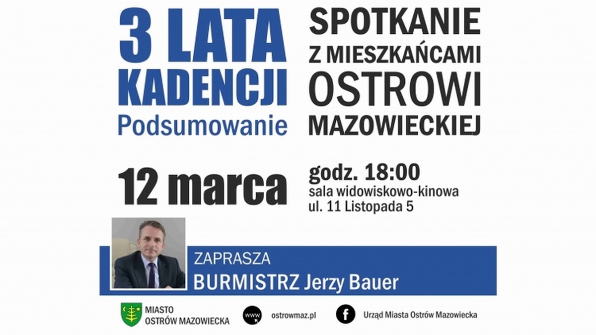 Burmistrz Jerzy Bauer zaprasza mieszkańców Ostrowi Mazowieckiej na spotkanie, którego tematem będzie podsumowanie trzech lat kadencji.