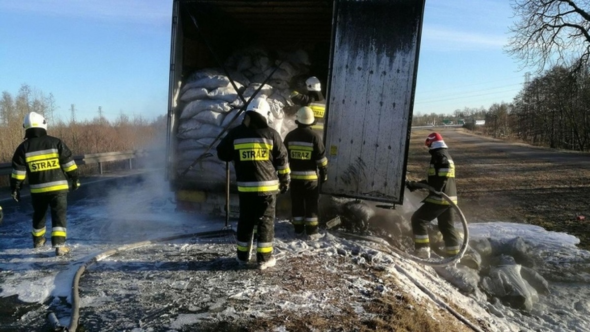 Trzy jednostki strażackie gasiły pożar, do którego doszło na drodze wojewódzkiej nr 627 w Małkini Górnej. W płomieniach stanęła przyczepa samochodu ciężarowego przewożącego workowany węgiel drzewny.