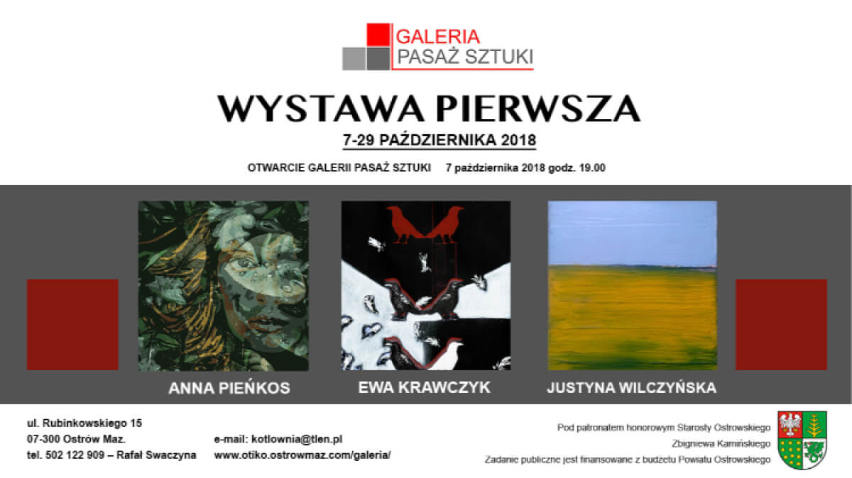 Pierwsza wystawa, realizowana we współpracy z Powiatem Ostrowskim w ramach obchodów piętnastolecia Sceny Kotłownia, będzie wystawą trzech lokalnych artystek, Anny Pieńkos, Ewy Krawczyk oraz Justyny Wilczyńskiej