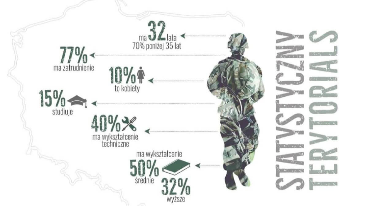 Dane statystyczne pokazują, że średnia wieku żołnierza obrony terytorialnej to 32 lata, a zdecydowaną większość, bo aż 70 proc. stanowią ludzie młodzi, w wieku poniżej 35 lat. Blisko 77 proc. jest aktywnych zawodowo, a ok. 15 proc. studiuje. Około 50 proc. ma wykształcenie średnie, a 32 proc. wyższe. Co dziesiąty terytorials jest kobietą.