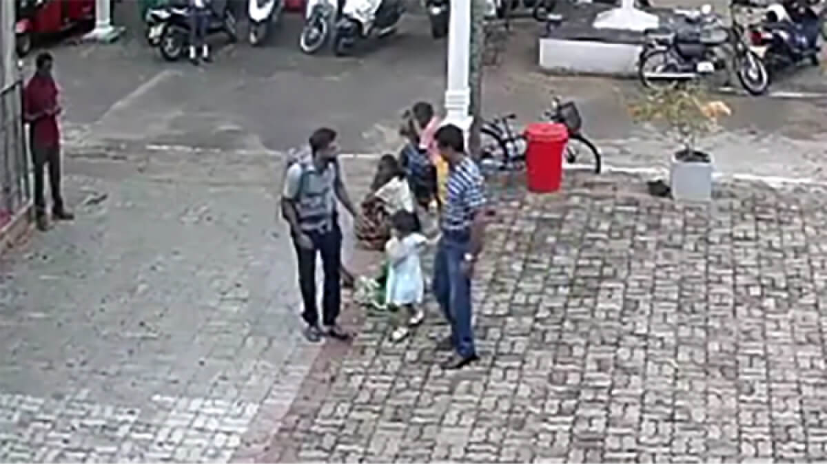 Na chodniku wpada na niego dziecko, które ten klepie po głowie. Następnie mężczyzna wtapia się w tłum osób stojących przed świątynią i wchodzi do budynku pełnego ludzi.