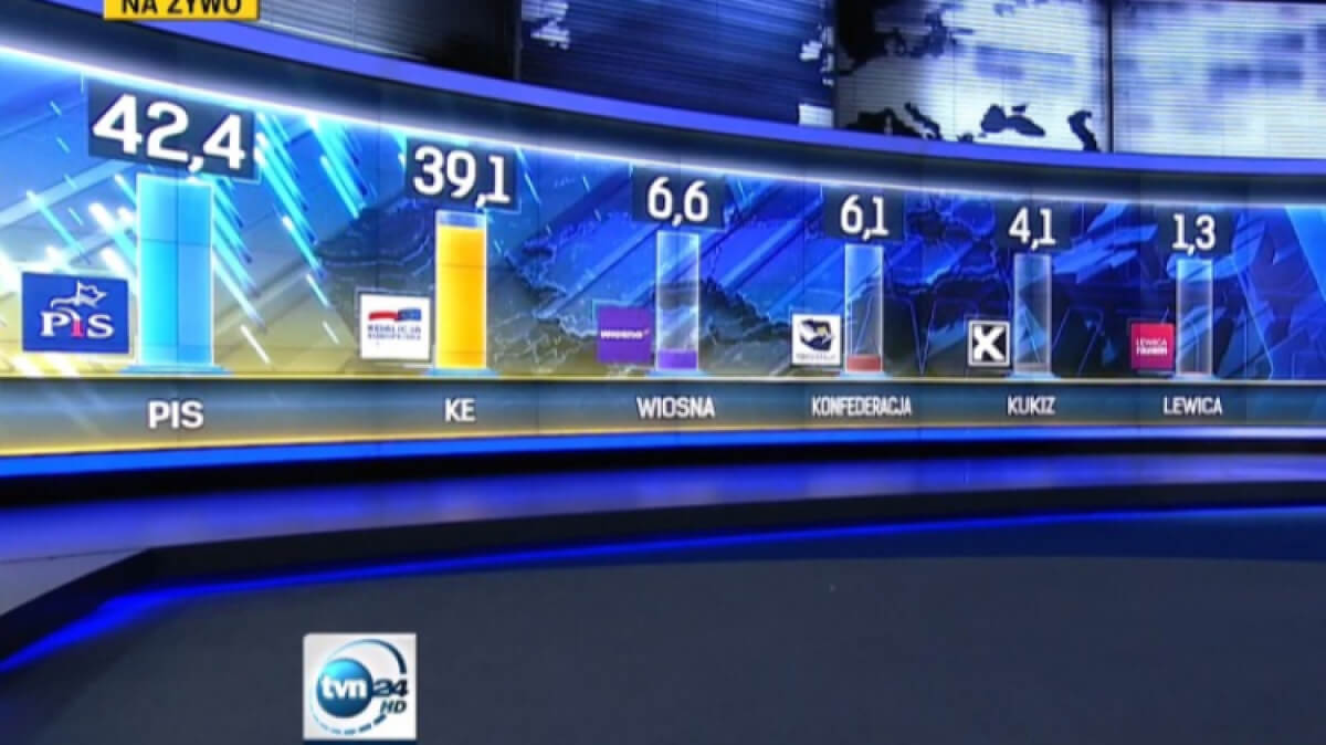 Według wstępnych szacunków PiS może liczyć na 24 europoselskie mandaty. Koalicja Obywatelska wyśle do Brukseli 22 europosłów. Partia Roberta Biedronia i Konfederacja uzyskały po trzy mandaty. Wyniki mogą być obarczone błędem i ostateczny podział mandatów prawdopodobnie będzie się nieco różnił.