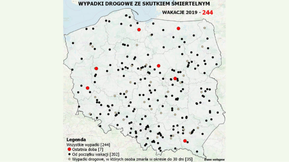 Funkcjonariusze policji na bieżąco uzupełniają mapę wypadków drogowych ze skutkiem śmiertelnym "Wakacje 2019". W skali kraju odnotowano dotąd 244 takie wypadki (202 od początku wakacji). Ostatniej doby na terenie kraju doszło do siedmiu tragicznych w skutkach wypadków drogowych.