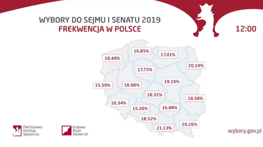 Jak podała komisja, liczba osób ujęta w spisach uprawnionych do głosowania to 29 546 182 osób, frekwencja na godzinę 12:00, wyniosła 18,14% w skali kraju.