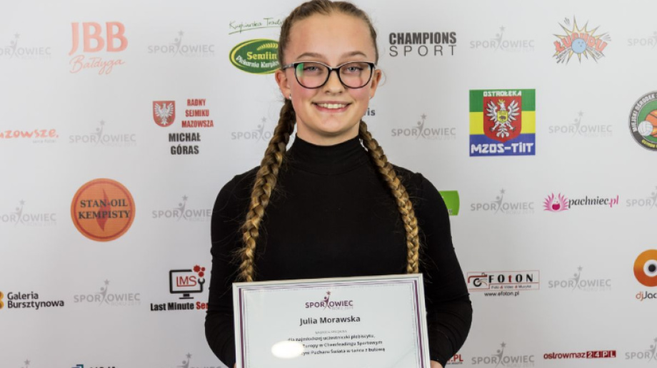 Od kilku lat Julia Morawska z powodzeniem rywalizuje na zawodach w cheerleadingu sportowym. W naszym plebiscycie Sportowiec Roku 2019 z rąk przewodniczącego rady miasta Wojciecha Zarzyckiego odebrała nagrodę dla najmłodszej uczestniczki.