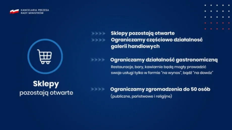 - ograniczenie funkcjonowania galerii handlowych (apteki, sklepy spożywcze i drogerie działają wszędzie - również w galeriach i centrach handlowych!),