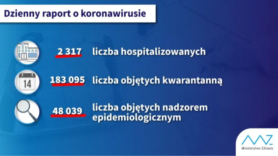 Ministerstwo Zdrowia podało dziś, że 2317 osób jest hospitalizowanych, ponad 183 tysiące przebywa w kwarantannie domowej, a ponad 48 tysięcy jest objętych nadzorem epidemiologicznym.