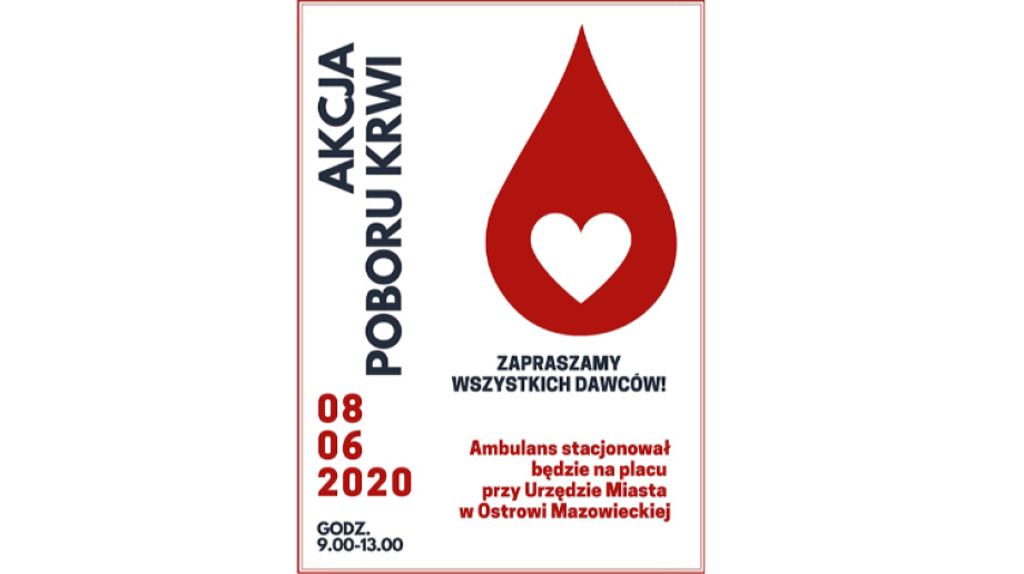 W poniedziałek 8 czerwca od godz. 9.00 będzie można oddać krew w ambulansie, który będzie stacjonował na placu przy Urzędzie Miasta w Ostrowi Mazowieckiej.