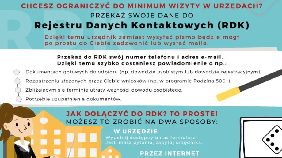 Osoby z dostępem do internetu chcące ograniczyć ilość swoich wizyt w urzędach, mogą zapisać się do Rejestru Danych Kontaktowych. Dzięki temu, urząd będzie kontaktować się z interesantami bezpośrednio przez maila, lub telefon.