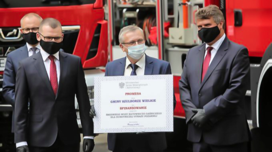 Swojego czasu informowaliśmy, że gmina Szulborze Wielkie uzyskała największą frekwencje w powiecie, co oznaczać będzie otrzymanie wozu strażackiego. 27.07.2020 odbyło się spotkanie na którym z rąk wiceministra MSWiA Maciej Wąsika, wręczono promesę kontraktową dla wójt gminy Szulborze Wielkie Krzysztofa Mariana Michalca.