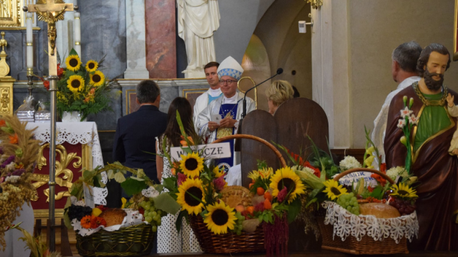 Uroczysta Msza święta dziękczynna w intencji rolników i mieszkańców Gminy i Parafii Wąsewo pod przewodnictwem Jego Ekscelencji Księdza Biskupa dra Janusza Stepnowskiego odbyła się o godz. 11.30. W czasie składania darów do ołtarza przyniesiono kosze dożynkowe jako wyraz wdzięczności Bogu za jego dary i prośbę o Boże błogosławieństwo dla parafii i rodzin.