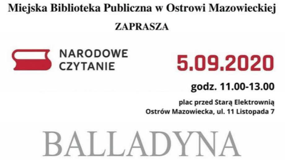 MBP zachęca do włączenia się i współtworzenia dziewiątej edycji "Narodowego czytania". Osoby chętne do odczytu fragmentów "Balladyny" proszeni są o kontakt do 1 września, osobiście lub telefonicznie pod numerem: 798 893 939, 798 894 141.