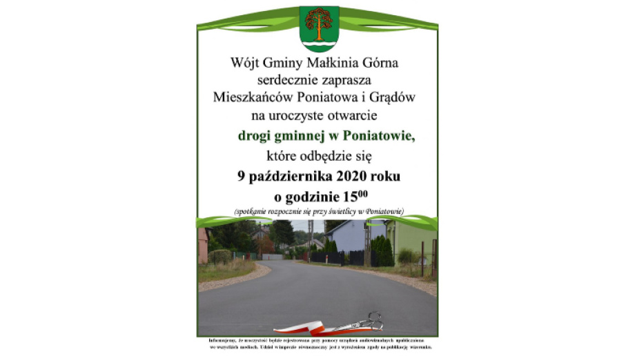 Wójt Gminy Małkinia Górna serdecznie zaprasza mieszkańców Poniatowa i Grądów na uroczyste otwarcie drogi gminnej w Poniatowie, które odbędzie się 9 października 2020 roku o godzinie 15:00, spotkanie rozpocznie się przy świetlicy w Poniatowie.