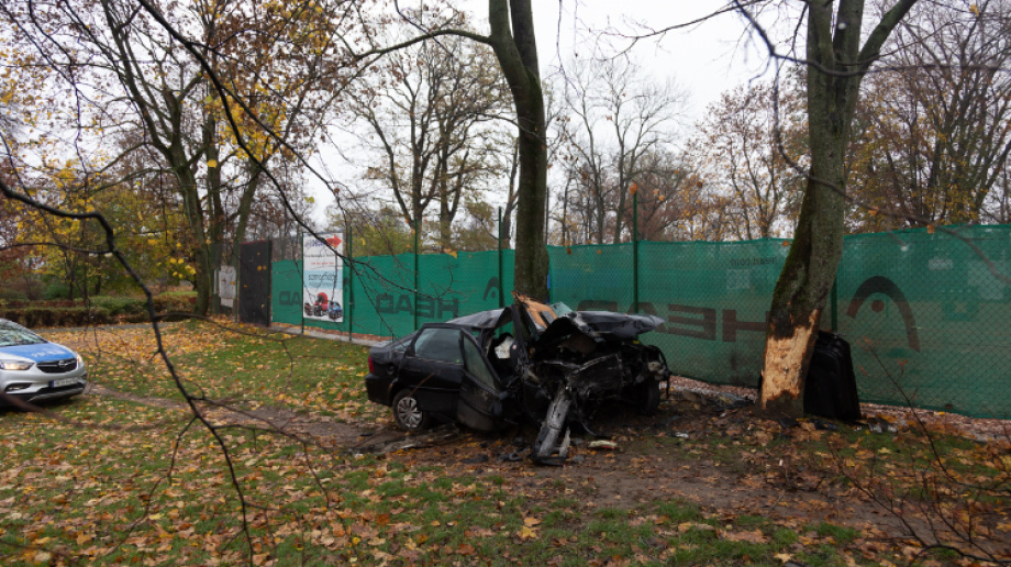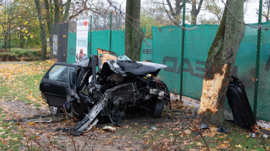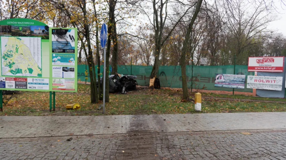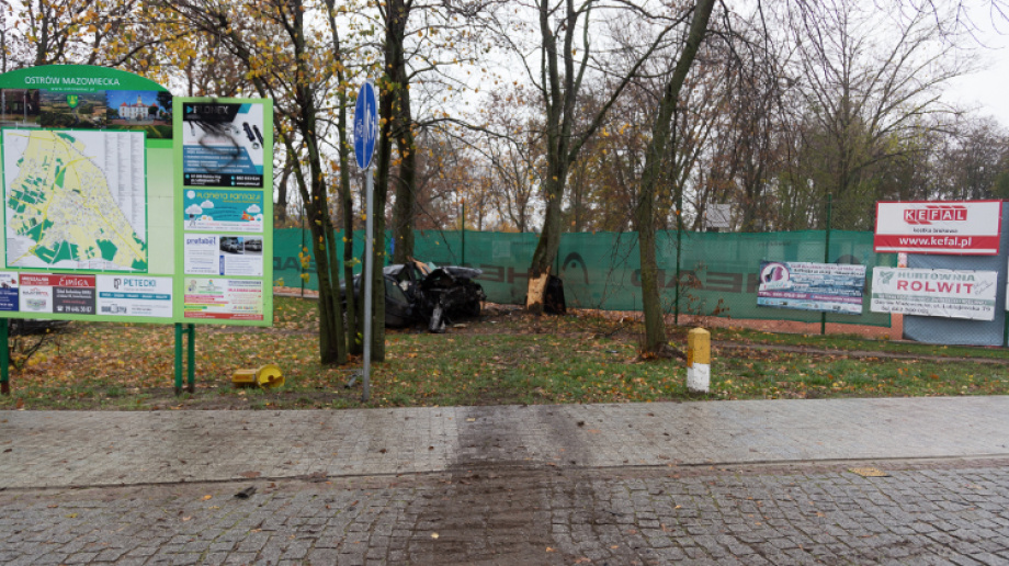 Kierujący pojazdem z nieustalonych dotąd przyczyn wjechał w drzewo zjeżdżając z ronda. Skutki wypadku wskazują na ogromną siłę uderzenia. Samochód został niemal całkowicie zniszczony.