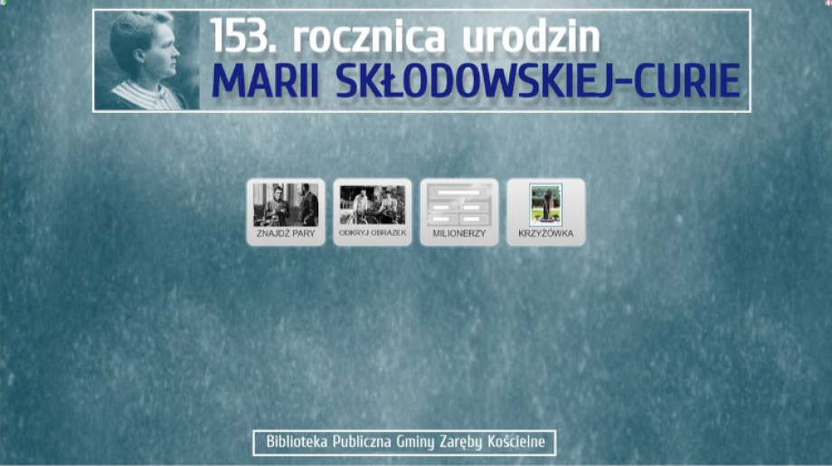 Biblioteka Publiczna Gminy Zaręby Kościelne dla swoich mieszkańców przygotowała ciekawą formę obchodów 153. rocznicy urodzin Marie Skłodowskiej-Curie, sławnej na cały świat polskiej noblistki, której gniazdo rodowe znajduje się w gminie we wsi Skłody-Piotrowice.