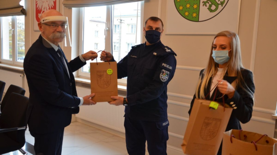 Starosta Ostrowski Zbigniew Chrupek na ręce Komendanta Powiatowego Policji w Ostrowi Mazowieckiej przekazał elementy odblaskowe, które będą rozdawane przez policjantów mieszkańcom naszego powiatu podczas akcji profilaktycznych.