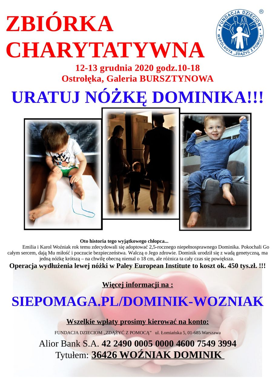 12-13 grudnia odbędzie w Galerii Bursztynowej zbiórka pieniężna dla Dominika ale już teraz można wpłacać darowizny na konto: