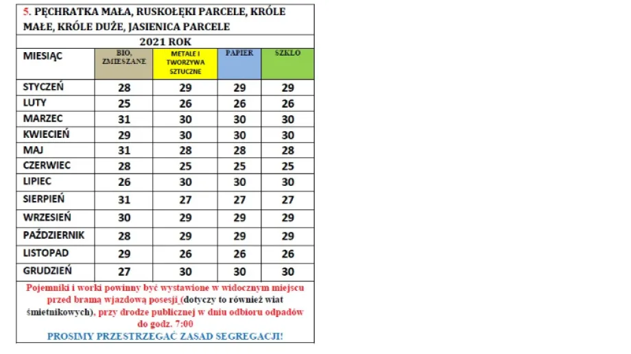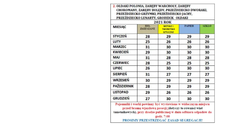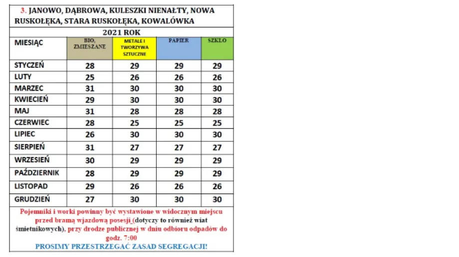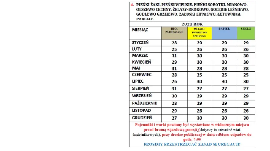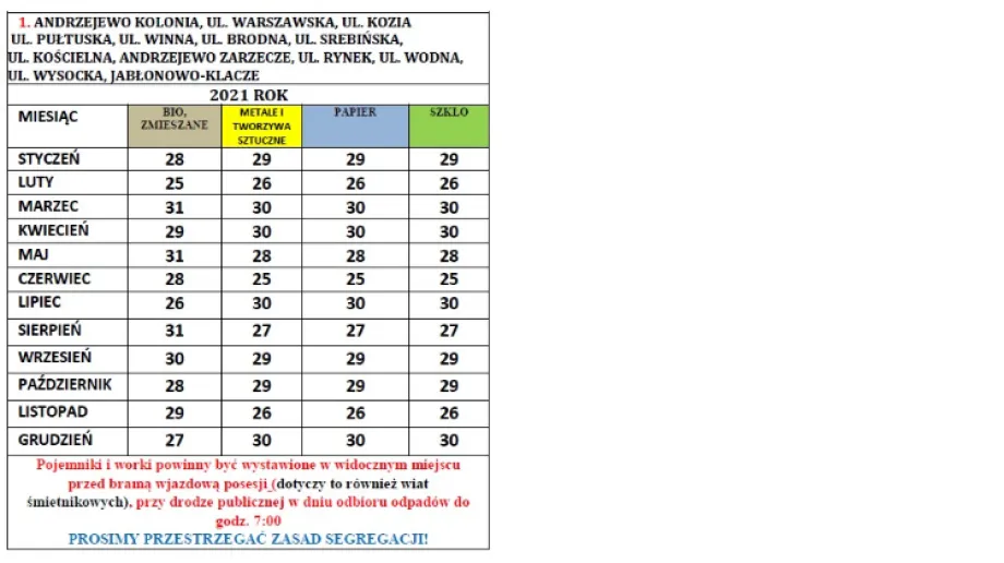Gmina Andrzejewo opublikowała plan wywozu śmieci na rok 2021. Harmonogram podzielony jest na odpady bio, zmieszane, metale i tworzywa sztuczne, papier oraz szkło.
