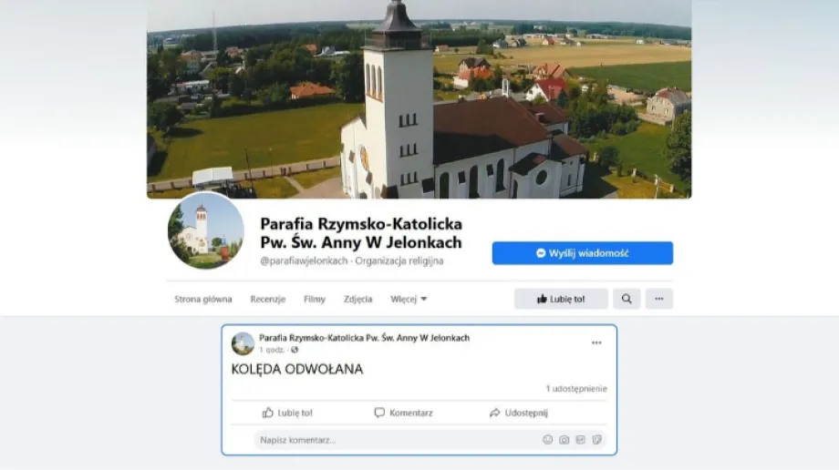 Po przesłanym do nas e-mailu z łomżyńskiej kurii diecezjalnej, ukazała się informacja zamieszczona na profilu facebookowym parafii pw. św Anny w Jelonkach o odwołaniu kolędy (wpis już został usunięty).