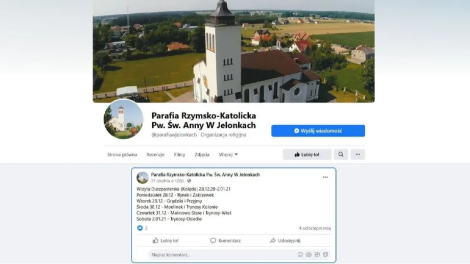 Środek pandemii, zalecenia sanitarne, obostrzenia - wszystko po to, aby możliwie jak najszybciej powrócić do normalności. W parafii pw. św. Anny w Jelonkach w gminie Ostrów Mazowiecka na nic zdają się apele lekarzy o dystans społeczny i ograniczanie spotkań. Proboszcz parafii w Jelonkach dla swoich wiernych zaplanował tradycyjne wizyty duszpasterskie. Na facebookowym profilu parafii podany został harmonogram kolędy (wpis już został usunięty).