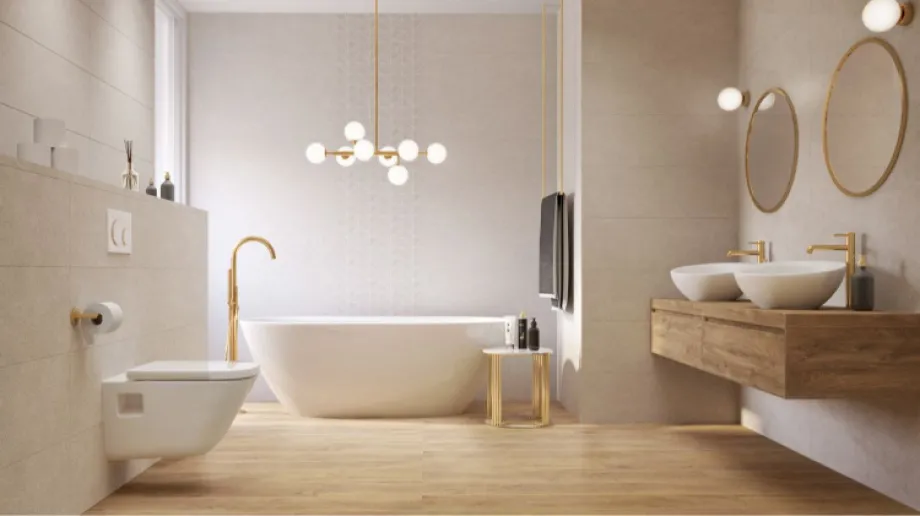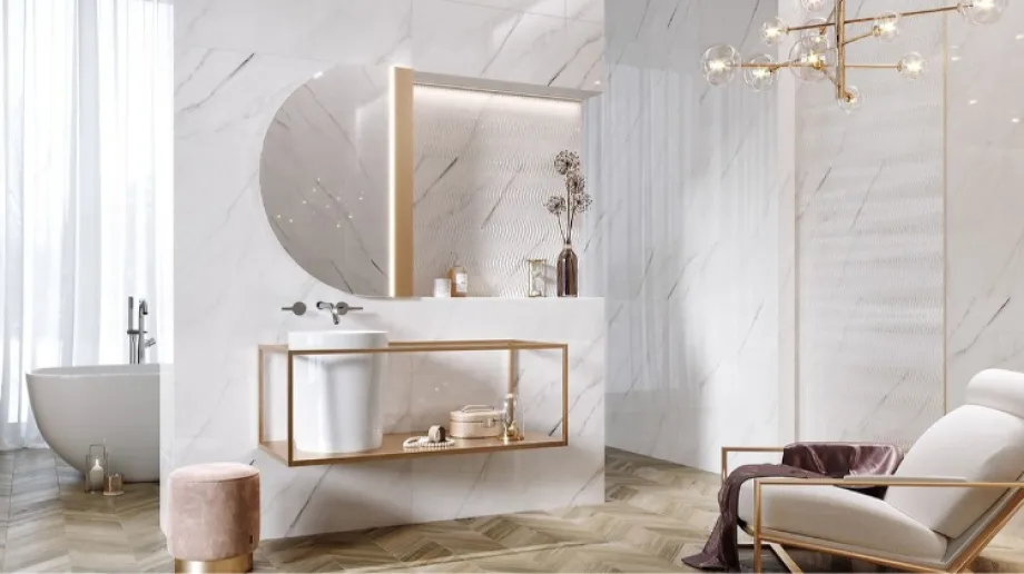 W łazience w stylu glamour na końcowy efekt aranżacji ma wpływ wiele mniejszych, składowych elementów. Odpowiedni wybór ceramiki, armatury oraz rodzaju płytek sprawi, że wykreujemy ponadczasowe, pełne elegancji wnętrze. Wybierając płytki, warto przyjrzeć się kolekcjom inspirowanym marmurowymi powierzchniami. Ciekawie prezentują się kolekcje dostępne w wielkim formacie. W łazience glamour wybrane ściany możemy także ozdobić dekoracyjną mozaiką, czy listwami.