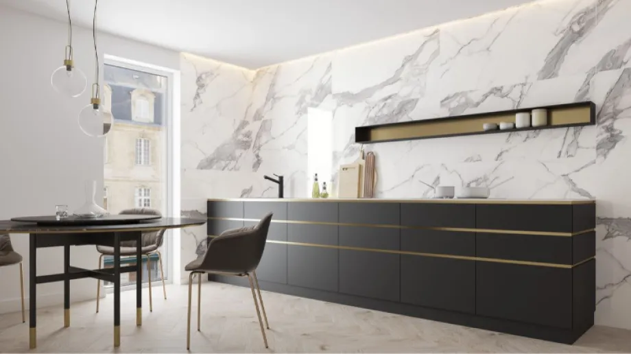 Nowoczesna kuchnia w stylu glamour - połączenie jasnych, wielkoformatowych płytek i zabudowy meblowej w ciemnym kolorze. Fot. Cerrad