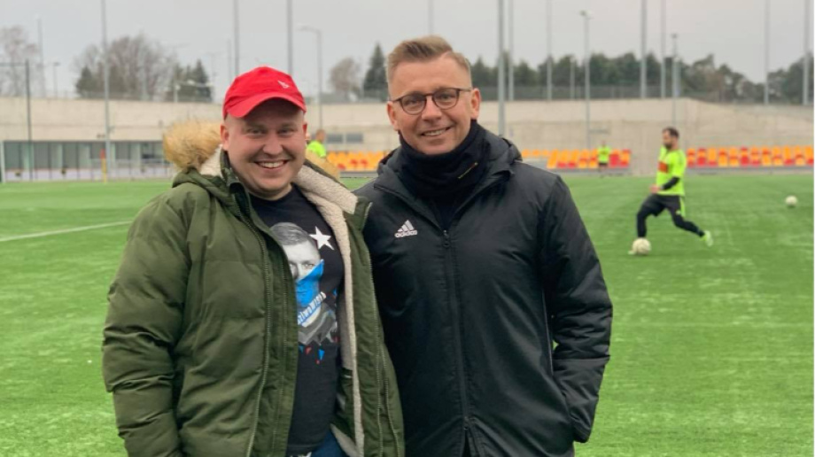 Paweł Kowalczyk (z prawej) na wspólnym zdjęciu z Kamilem Wojdakiem, kontuzjowanym kapitanem KS Wąsewo