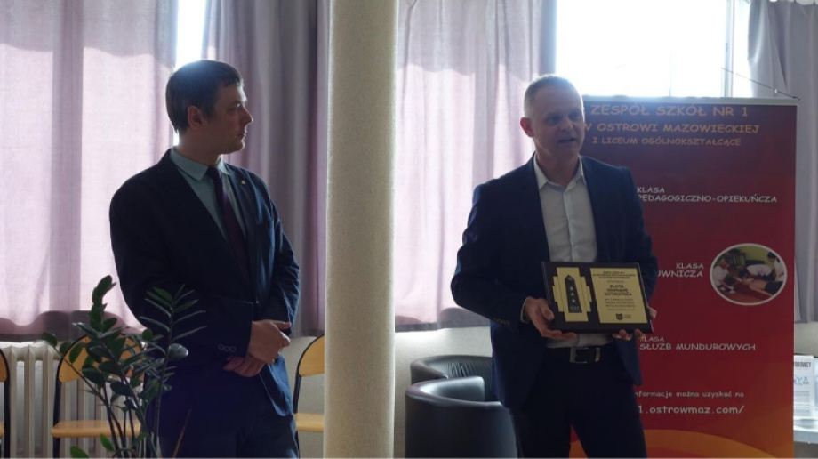 We wtorek 15 czerwca w Zespole Szkół nr 1 w Ostrowi Mazowieckiej odbyło się ważne wydarzenie, z którego cieszy się cała szkoła. Dyrektor ZS nr 1 odebrał Złotą Odznakę Rotmistrza od pana Karola Madaja za zajęcie przez grupę ze szkoły I miejsca w I Turnieju Szkół im. Rotmistrza Witolda Pileckiego.
