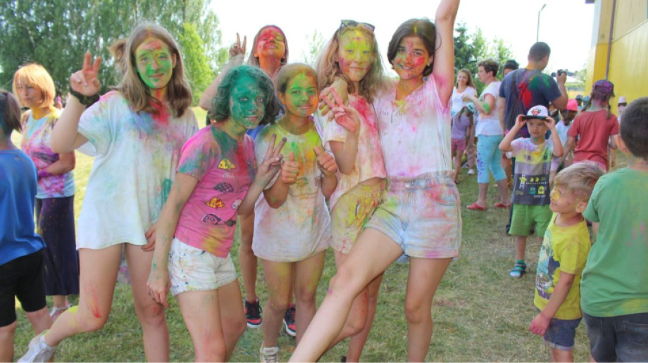 Kolorowe szaleństwo ogarnęło uczniów, różnokolorowe pyłki pokrywały ich ubrania, włosy i twarze.
