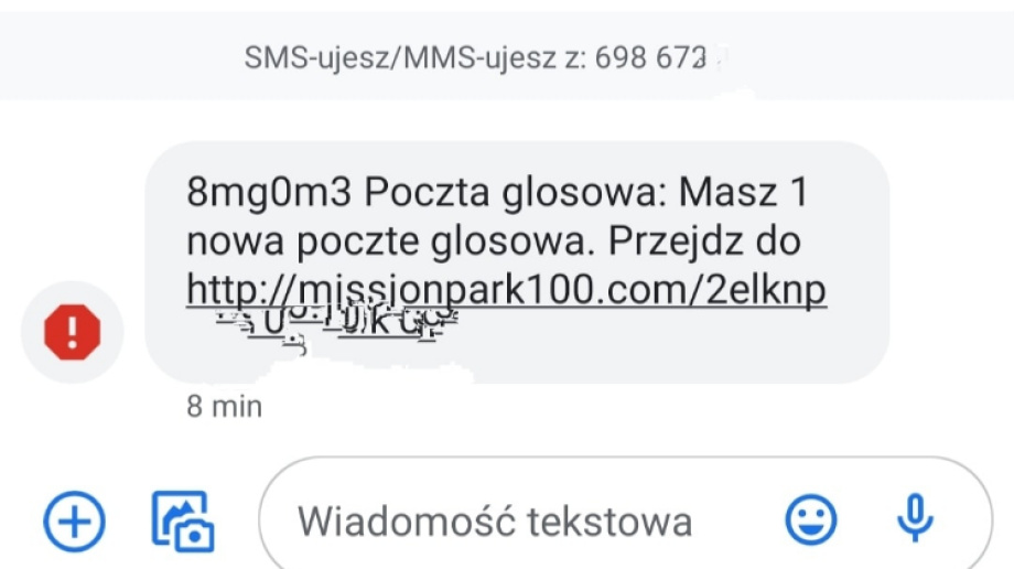 Kolejnym pomysłem oszustów internetowych jest podszywanie się pod operatora telekomunikacyjnego. Oszust wysyła wiadomość z linkiem, która sugeruje o nieodsłuchanej poczcie głosowej.