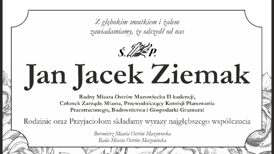 Jan Jacek Ziemak to Radny Miasta Ostrów Mazowiecka II kadencji, Członek Zarządu Miasta, Przewodniczący Komisji Planowania Przestrzennego, Budownictwa i Gospodarki Gruntami. Uroczystość pogrzebowa odbędzie się w środę 25 sierpnia o godz. 14.00 w kościele pw. Chrystusa Dobrego Pasterza.