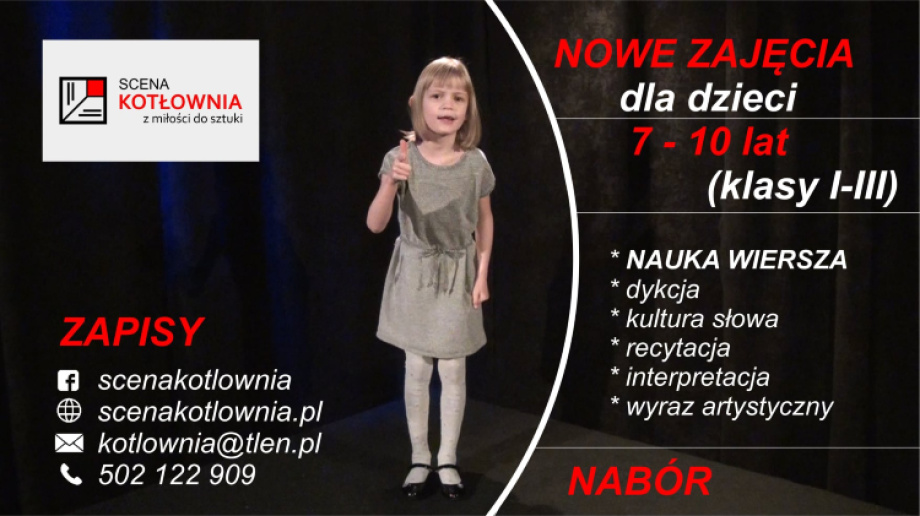 - Zajęcia aktorskie dla dzieci w wieku 7 - 10 lat, na których skupimy się na ćwiczeniu pamięci, skupienia, interpretacją wiersza, dykcją, poprawną wymową, kulturą słowa, ruchem scenicznym. Jeżeli macie lub znacie dzieci, które przejawiają zdolności aktorskie, zaproście je do nas. - informują organizatorzy zajęć.