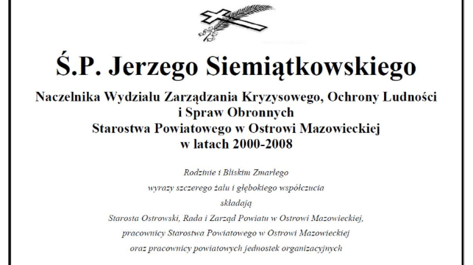 O śmierci mężczyzny poinformowało Starostwo Powiatowe w Ostrowi Mazowieckiej. Ś.P Jerzy Siemiątkowski był Naczelnikiem Wydziału Zarządzania Kryzysowego, Ochrony Ludności i Spraw Obronnych Starostwa Powiatowego w Ostrowi Mazowieckiej w latach 2000-2008.