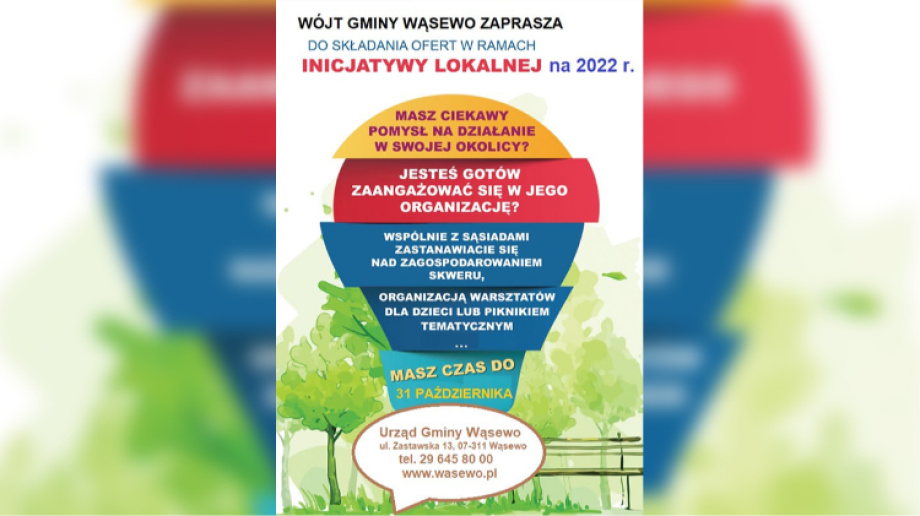 Urząd Gminy Wąsewo przypomina o składaniu wniosków na realizację inicjatyw lokalnych w 2022 roku. Jest to forma współpracy jednostki samorządu terytorialnego z mieszkańcami gminy chcąc wspólnie realizować zadanie publiczne na rzecz społeczności lokalnej gminy.