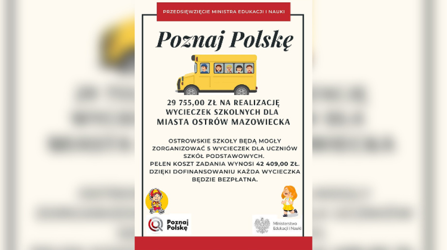 W ramach projektu "Poznaj Polskę" Miasto Ostrów Mazowiecka otrzymało dofinansowanie w wysokości 29 tys. 755 złotych na zrealizowanie wycieczek szkolnych. Program wspiera szkoły w realizacji zadań, które na celu mają zwiększenie atrakcyjności procesu edukacji poprzez umożliwienie uczniom poznawania Polski, środowiska, tradycji oraz zabytków kultury i historii, a także osiągnięć polskiej nauki.