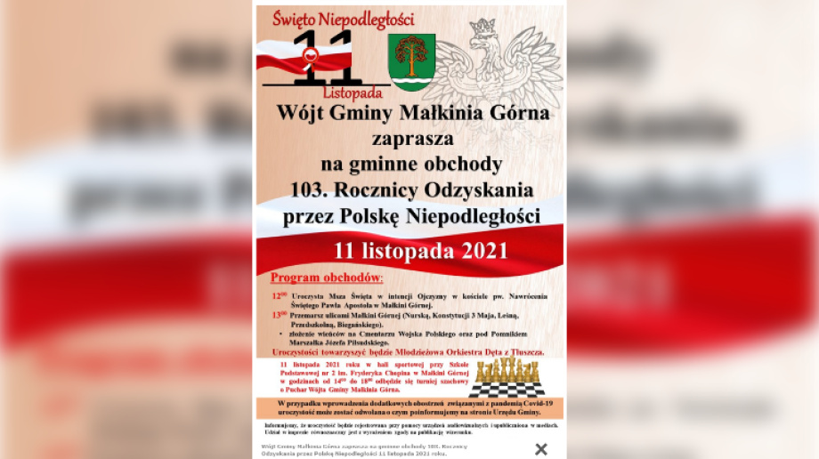 W Małkini Górnej w czwartek 11 listopada odbędą się gminne obchody Rocznicy Odzyskania przez Polskę Niepodległości. W przypadku wprowadzenia nowych obostrzeń dotyczących pandemii Covid-19 uroczystość może zostać odwołania, poinformują o tym władze gminy na stronie internetowej.