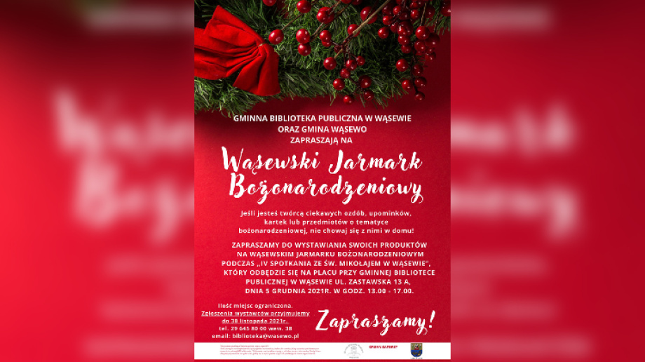 Gminna Biblioteka Publiczna razem z Urzędem Gminy w Wąsewie zaprasza do wystawienia swoich produktów podczas "Wąsewskiego Jarmarku Bożonarodzeniowego".