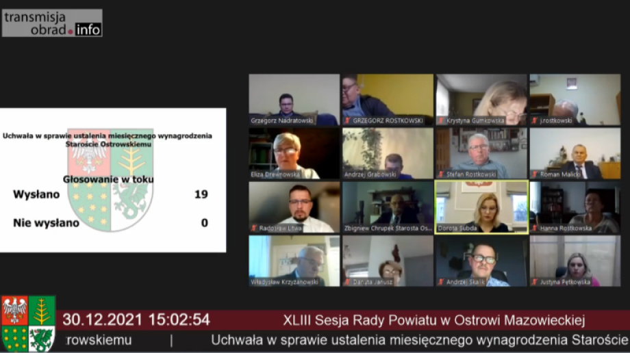 XLIII Sesja Rady Powiatu w Ostrowi Mazowieckiej odbyła się w czwartek 30 grudnia o godz. 14.30 w trybie zdalnym. Podczas tego spotkania 12 pozytywnymi głosami radnych podjęto uchwałę w sprawie ustalenia miesięcznego wynagrodzenia staroście ostrowskiemu.